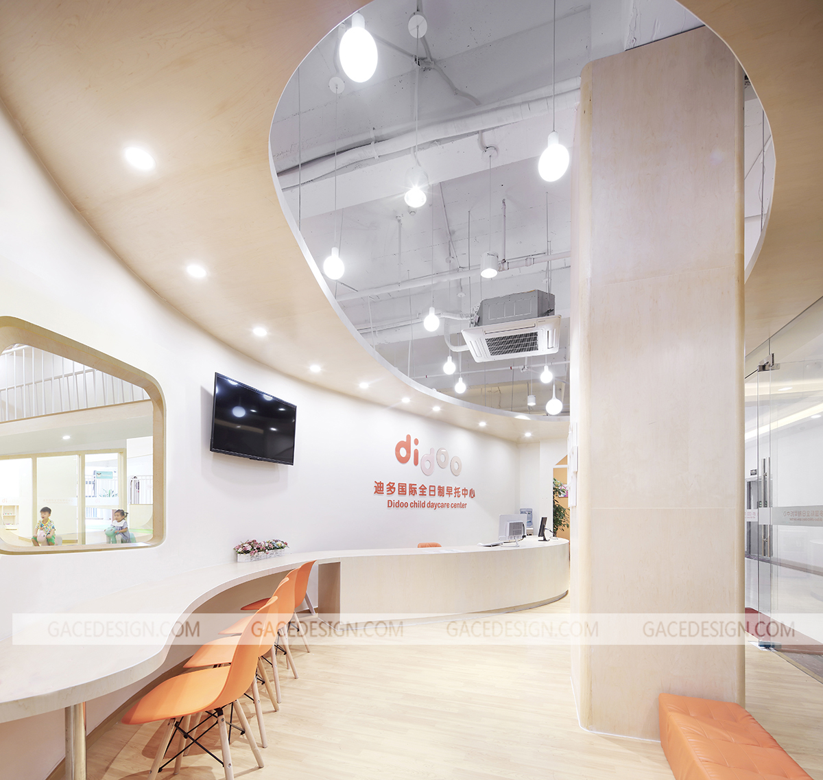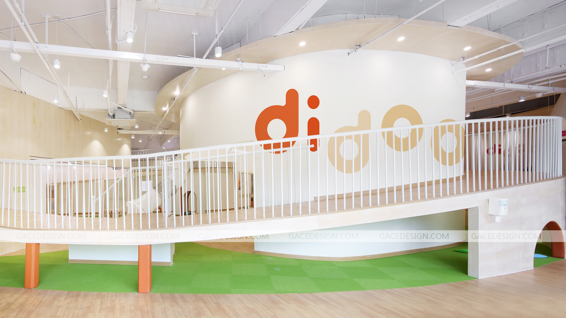 迪多國際全日制早托中心,為新時代父母提供安全,科學(xué),全面的幼兒全日制托管服務(wù),致力于培養(yǎng)2-6歲兒童優(yōu)秀的行為習(xí)慣、獨立人格及社交能力。作為全日制日托中心,是兒童的另一個家,這是一個謀求大尺度變化的空間設(shè)計,規(guī)避程式化的隔班教學(xué),將自然元素引入,打造全新的敘事空間。營造簡潔自由的空間,干凈的木色地板和青翠的草甸鋪陳開來,Didoo的橙色點綴其中,自然系配色去嘈雜化令空間更親和。