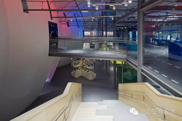 在大廳里,兩個(gè)宏大體量較天花板又上升了10米,一個(gè)體量繃緊而堅(jiān)硬,另一個(gè)體量柔軟而具有波動(dòng)性。它們由橋梁相連,人們通過(guò)橋梁來(lái)回走動(dòng)。游客會(huì)產(chǎn)生“哇”的驚嘆感,并被引入充滿誘惑和想象力的迷人世界,它激發(fā)人們的欲望和好奇心來(lái)參與學(xué)習(xí)、探索和創(chuàng)造的過(guò)程。