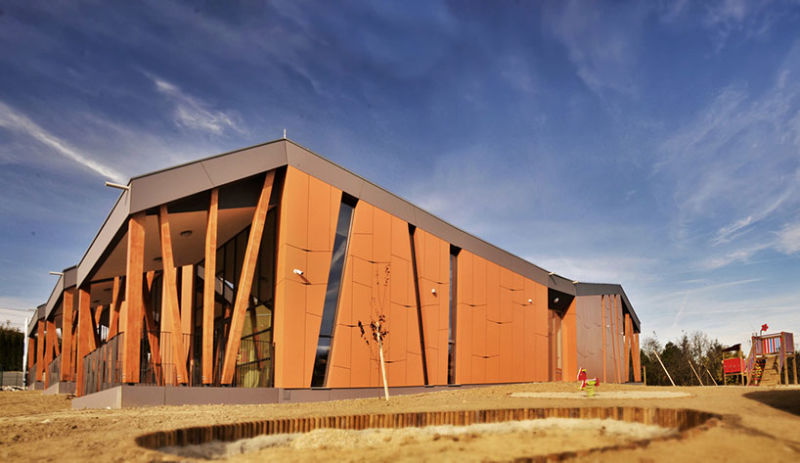 在斯洛文尼亞戈里采丘陵地區(qū)中心的一個(gè)名叫Cerkvenjak的小鎮(zhèn),建在山脊之上,是一座獨(dú)立的采用獨(dú)特的低延長(zhǎng)式設(shè)計(jì)與斜坡式的房頂結(jié)構(gòu),坐落在山脊之中,更顯出幾分傳統(tǒng)建筑韻味的幼兒園。