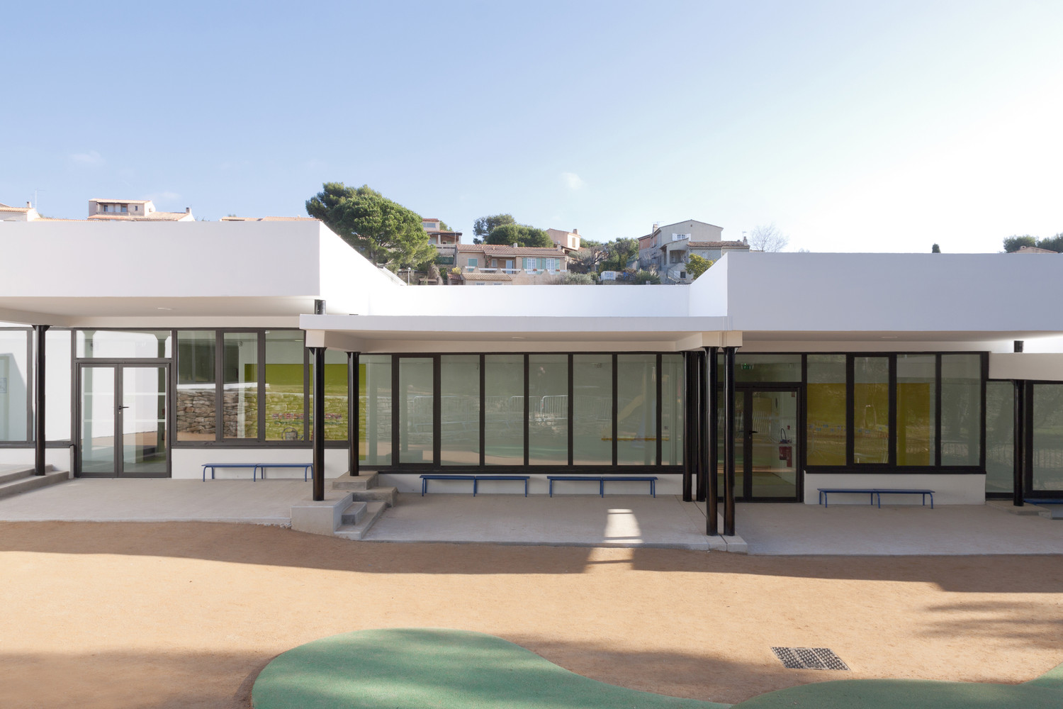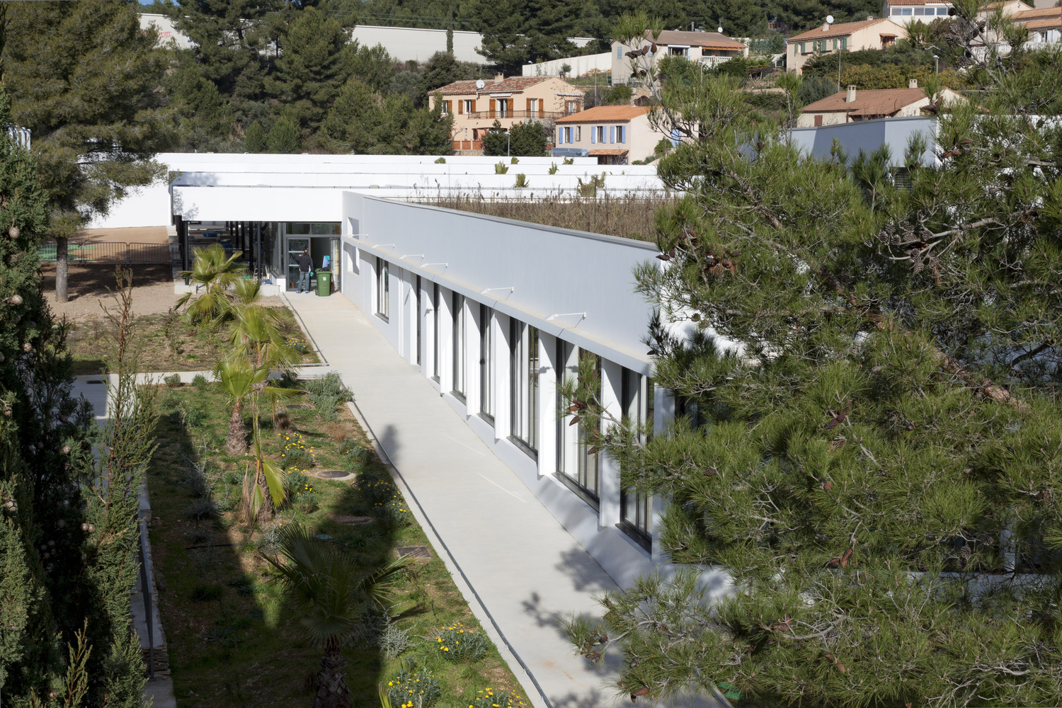位于法國(guó)的Les Severiers幼兒園這個(gè)幼兒園設(shè)計(jì)包括著三個(gè)部分,一個(gè)食堂和在Ciotat的住宅區(qū)內(nèi)的城市化發(fā)展。園方的想法是建造一個(gè)可以使它融入到現(xiàn)存的松樹林中這樣的幼兒園。幼兒園的不同體積微妙地形成了一個(gè)緩坡,這可以在學(xué)校中形成天然的間隔。