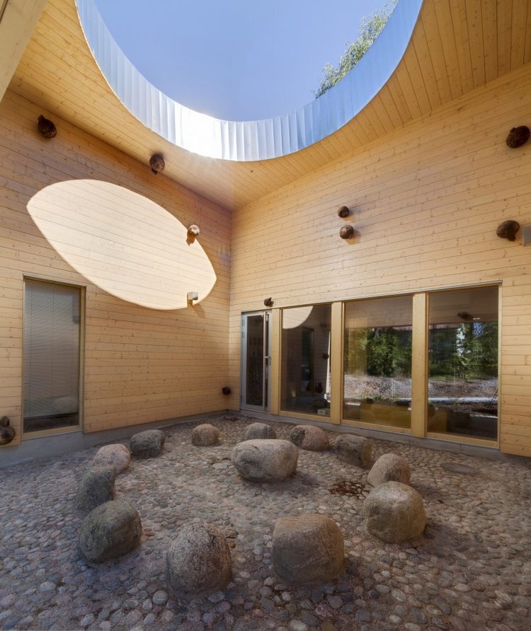 整個(gè)建筑鋪砌一新的內(nèi)部庭院朝向門(mén)廳開(kāi)放,會(huì)內(nèi)的天花板上有一個(gè)巨大的露天圓形開(kāi)口,隨著時(shí)間的推移使得移動(dòng)的陽(yáng)光成為了室內(nèi)庭院中一道亮麗的風(fēng)景,庭院內(nèi)還有這藝術(shù)家創(chuàng)作由20個(gè)落葉松木制作的球體組成,代表著宇宙的雕像。(幼兒園室內(nèi)設(shè)計(jì))