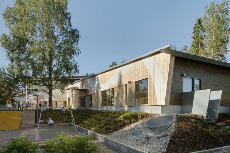 Omenapuisto日托中心位于芬蘭赫爾辛基,整個(gè)建筑主要的由單層體量構(gòu)成,兩層高的部分是一個(gè)多功能的高挑空間,并且在這個(gè)空間設(shè)計(jì)有著一個(gè)通風(fēng)裝置室和陽(yáng)臺(tái),整個(gè)建筑所在場(chǎng)地非常狹窄,項(xiàng)目的目標(biāo)是打造輕盈開(kāi)放的體量,屋頂吵兩個(gè)方向緩緩傾斜每一端都有一個(gè)大水槽將雨水排放到石頭鋪砌的水池中,并由此滲入地面,場(chǎng)地內(nèi)水平高度的自然差異被用作坡道,與相鄰的道路形態(tài)相呼應(yīng)。(幼兒園設(shè)計(jì))